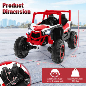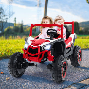 Share the adventure with the 24V 2-Seater Kids Ride On UTV in Red, perfect for two kids aged 3 and up with a 110 lbs capacity. Equipped with two wide seats, 3-point safety belts, and lockable doors, this UTV prioritizes safety. A 2.4G remote offers parental control, while headlights, taillights, and a music system add excitement. The 24V battery and spring suspension ensure a smooth, extended ride on multiple surfaces.