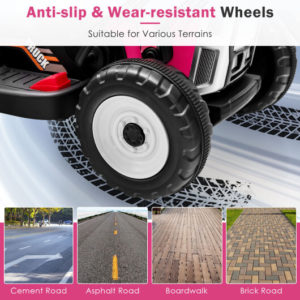 Dig into fun with this pink 12V ride-on excavator, designed for kids aged 3 to 8. Made from PP and steel, this 49 x 20 x 20.5-inch vehicle supports up to 66 lbs and reaches speeds of 1.9-5 mph. Powered by a 12V 7AH battery, it offers two modes: manual control with a steering wheel and foot pedal or parental remote control. Kids can adjust the bucket’s height and angle for realistic digging play. Features include a headlight, horn, USB, and wireless connectivity for entertainment, while anti-slip wheels ensure smooth rides on brick, cement, wood, or asphalt roads. A slow start function, wide seat with backrest, and ASTM/CPSIA certifications ensure safety and comfort for young adventurers.