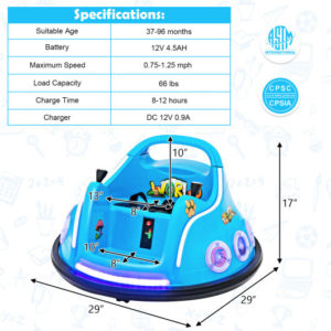Ignite your child’s sense of adventure with this stylish navy 12V electric ride-on car, perfect for kids aged 3-8. Powered by a 12V battery, this car offers speeds from 0.75 to 1.25 MPH, ensuring a safe and fun ride. The 360-degree rotation feature, enabled by sturdy universal wheels, allows for exciting maneuvers, while front LED lights and side breathing lights add a playful glow. Parents can ensure safety with the remote control, featuring low, middle, and high-speed settings, or kids can drive using dual joysticks for a hands-on experience. The media function provides entertainment, and the charming cartoon pattern design enhances the fun. Built with a durable PP and metal frame, this ASTM and CPSIA-certified ride-on is ideal for birthdays or special occasions, offering reliable performance for indoor or outdoor play.