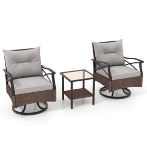Elevate your outdoor experience with this 3-piece patio set, featuring two swivel rocking chairs and a 2-tier tempered glass side table. Designed for comfort and style, it’s ideal for porches, gardens, or backyards, providing a relaxing spot for lounging or entertaining.