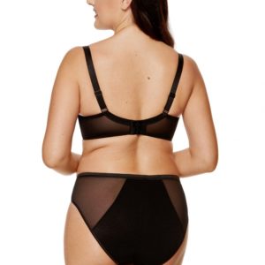 Padded bra in black color. Three-piece bowls made of thin corsetry foam coated on the outside with embossed checkered fabric. The inner part of the cups is covered with OEKO-TEX-standard cotton, making them skin-friendly. Vertical side whalebones stabilize the bra’s circumference. The back of the bra is made of tulle. The bra was designed and sewn in Poland.