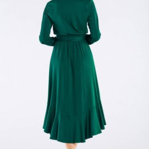 Ladies dress made of natural viscose. Envelope neckline adds an elegant style. A waist tie emphasizes the figure. Finished with overlapping frills that add lightness. Sleeves finished with elastic bands allowing for easy adjustment of their length. Product made in Poland.