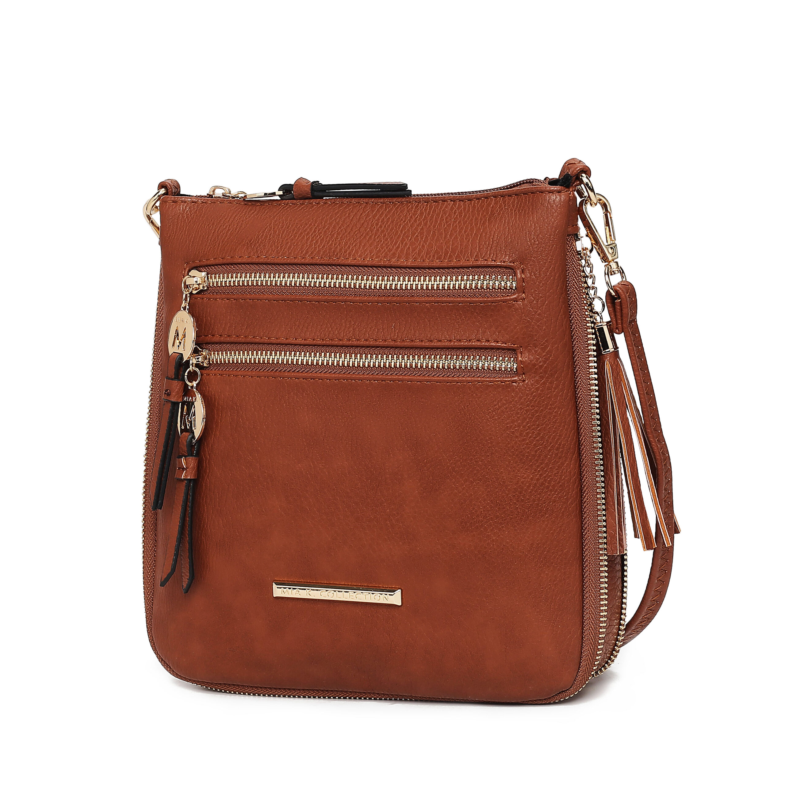 Our Angelina Crossbody is a chic, compact crossbody bag to keep you organized on-the-go. Crafted from grainy high-quality faux leather, its minimalist silhouette unzips to reveal multiple slip and zip pockets to safely store all your essentials, while polished gold-tone hardware accents lend subtle flair. The exterior features a convenient back zippered pocket, and two front zippered pockets. The side is accented with a decorative tassel and the side zipper expands the size of the bag. The slim design offers the perfect solution for days or night out.