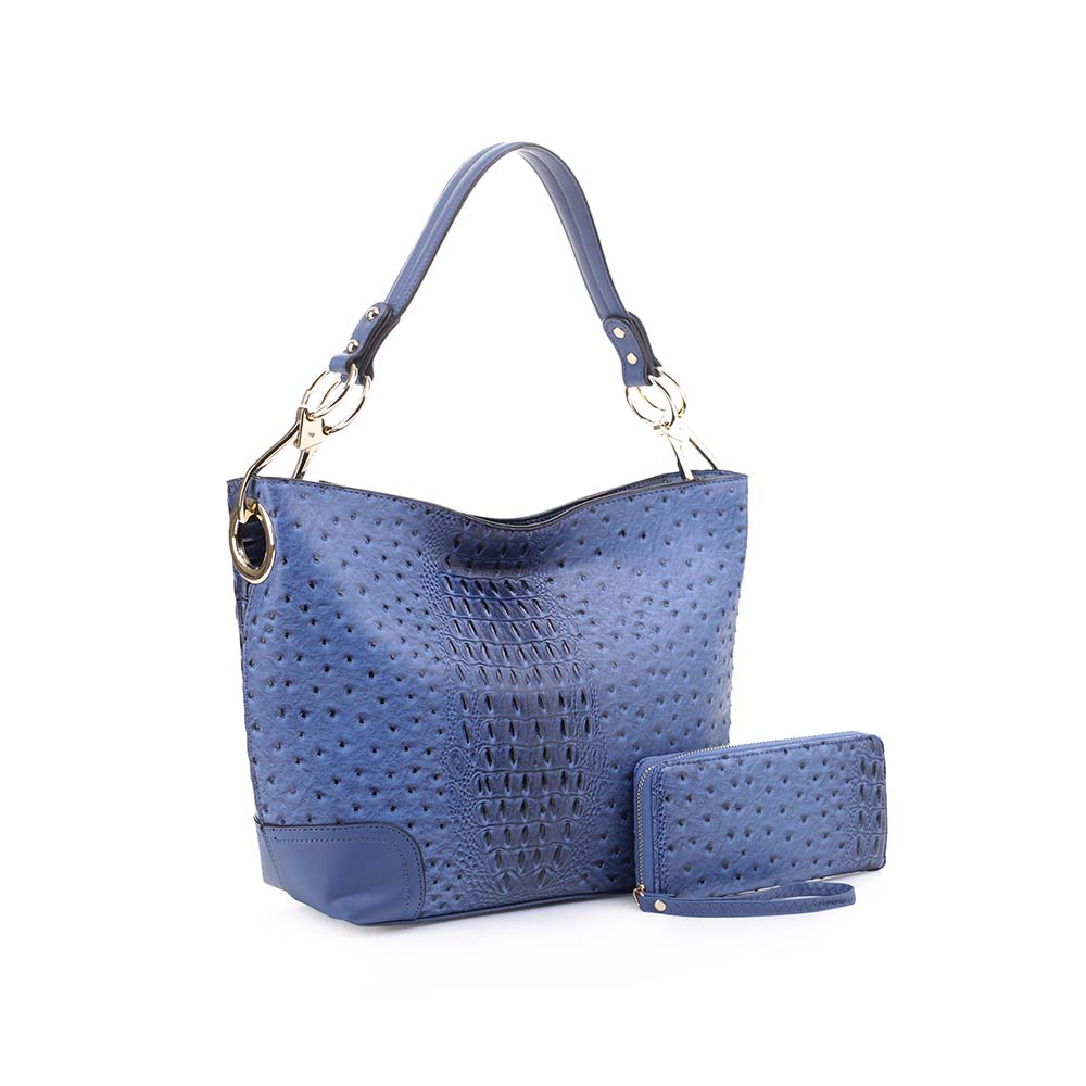 Material: Made of high-quality Vegan leatherFabric liningFeature: Designed with luxurious gold tone embellishments Metal feet to keep purse upright positionZip top closurePockets: Interior features a spacious compartment with slip in and zippered pockets Exterior features back zippered pocket Measurements: 14 in L x 10.5 in H x 4 in DWallet measurements: 8 in L x 4 in H x 1.5in D Removable Handle drop 8 in