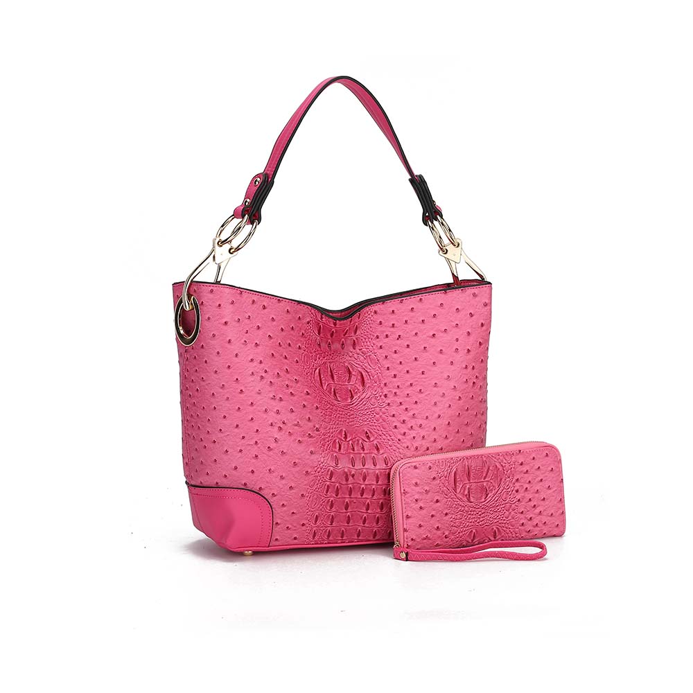 Material: Made of high-quality Vegan leatherFabric liningFeature: Designed with luxurious gold tone embellishments Metal feet to keep purse upright positionZip top closurePockets: Interior features a spacious compartment with slip in and zippered pockets Exterior features back zippered pocket Measurements: 14 in L x 10.5 in H x 4 in DWallet measurements: 8 in L x 4 in H x 1.5in D Removable Handle drop 8 in