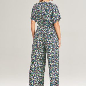 Loose jumpsuit with wide 7/8 legs. Wrap front. Snap closure. Dropped kimono-style sleeve. Tied at the waist.