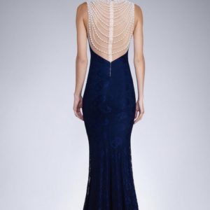 Long mermaid type dress in navy blue. Top layer of dress is made of lace. Dress is fastened with a covered zipper. Perfect for an evening party.