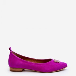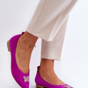 Elegant ballerinas made of natural suede. The almond-shaped noses optically slenderize the legs. Slightly profiled, soft leather insole will provide comfort during use. On the front there is an ornament in the form of a butterfly. In addition, this model has a stiffened heel counter.